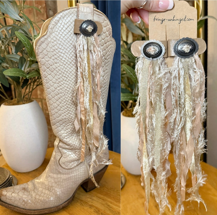 Each boot tassel is handmade by Lindsay using a curated blend of hand-dyed 100% silk, vintage lace, sparkly trims, and textured fabrics. Every strap secures to your cowboy boots to add fun, flair, and western charm — perfect for dancing or dressing up any outfit.